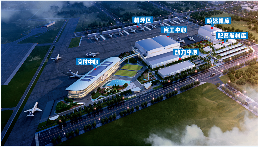 它占地面积24.5万平方米,包括交付中心、完工中心、喷漆机库等16个建筑单体,以及可同时停放11架飞机的机坪区。项目正式投产后,可实现每年完工交付约30架次飞机的产能目标。