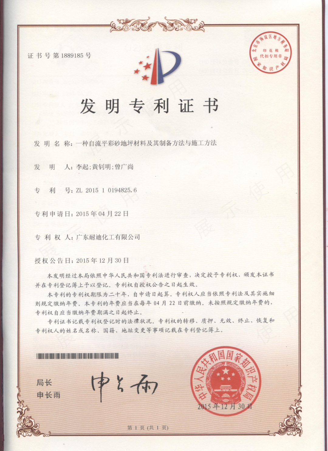 广东耐迪化工有限公司与2013年成功研发了《一种自流平彩砂地坪材料及其制备方法与施工方法》,并于2015年获得了发明专利证书!